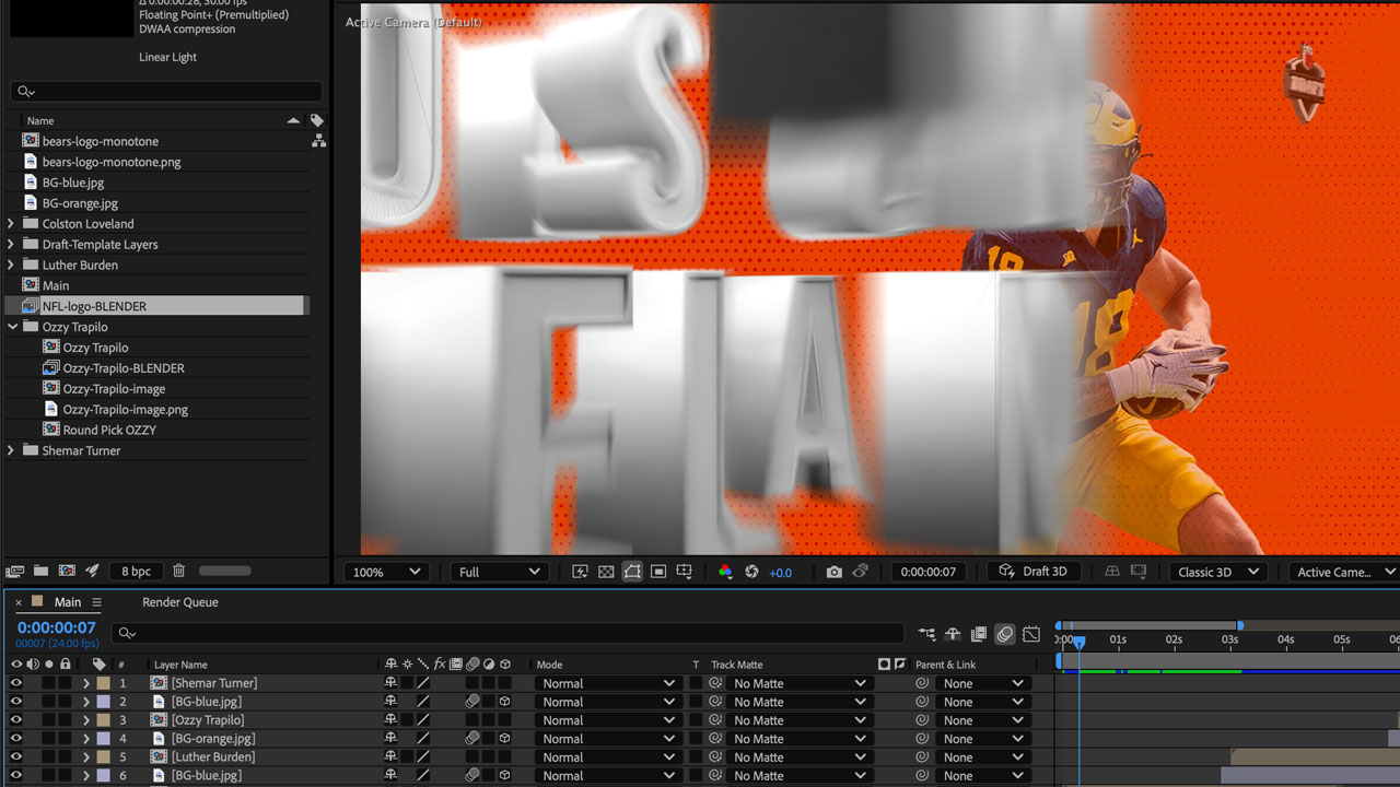 For the final compositing, using the brand guidelines and color palette specified by the Chicago Bears, I created the main animated cards in After Effects, combining sharp 2D graphics with the 3D elements from Blender.